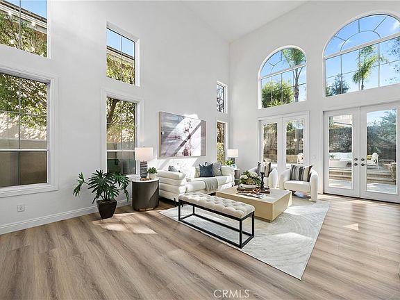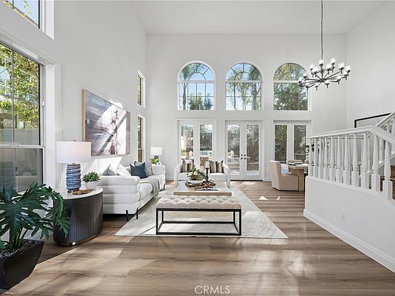 This spectacular residence offers a bright and open floor plan highlighted by soaring two-story ceilings in the living and dining rooms. Dramatic floor-to-ceiling windows and French doors fill the home with natural light and create an elegant sense of scale.