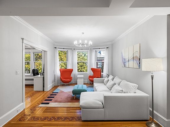 Tucked away on tree-lined Browne Street near Coolidge Corner, this rare and expansive floor-through 4-bedroom home includes an exclusive 2-car garage plus an additional off-street space—three dedicated parking spots in total. A gracious foyer opens to sunlit, generously scaled rooms, including a fireplaced family room and oversized living and dining areas. The updated eat-in kitchen features new appliances, stone countertops, and ample storage. A private hallway leads to four bedrooms, two full baths, and a peaceful three-season porch ideal for a home office or reading nook. With central air, high ceilings, large private storage in the basement, and original architectural details, this home blends classic charm with modern comfort. Set in a well-maintained, 100% owner-occupied building with a newer roof, boiler, and updated electrical. Just moments to the B & C lines, top schools, local parks, and Coolidge Corner's shops and restaurants—this is Brookline living at its best!