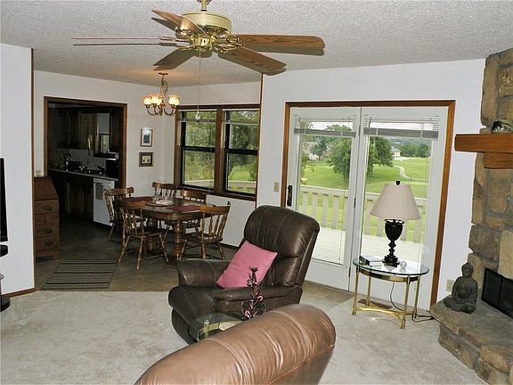 Location! Location! Across the street from the rec center & 1st tee/fairway of executive golf course. Awesome 180 degree view of course, surrounding hills, and golf course pond. split floor plan with common living areas over looking view. Both bedrooms can handle a king. Master bath has 2 sinks, jetted tub, master bedroom has walk in closet. Open concept with wood burning fireplace and access to east facing decck. Kitchen has pantry. 2 car garage. Newer roof, stove, microwave, additional toilet in utility, LED fans, paint. Fine home.