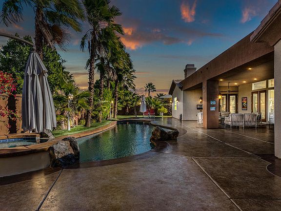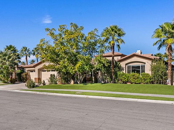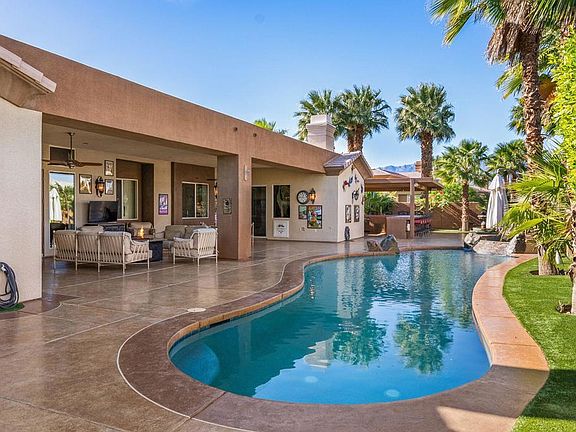 Located at the end of a quiet cul-de-sac within the prestigious gated community of Versailles, 18 Calais Circle offers refined desert living with exceptional privacy and scale. This single-level residence spans approximately 4,456 square feet and is situated on a generous lot with no rear neighbors, showcasing mountain views and a seamless indoor-outdoor lifestyle.The home welcomes with soaring ceilings, travertine floors, and abundant natural light throughout thoughtfully designed living spaces accented by multiple fireplaces. The gourmet kitchen is ideal for both everyday living and entertaining, featuring granite countertops, a large center island, walk-in pantry, gas cooktop, double ovens, and ample cabinetry, all opening to adjacent living and dining areas.Five spacious bedrooms, each with its own en-suite bath, provide comfort and privacy for owners and guests. The primary suite is a serene retreat with direct patio access, fireplace, spa-like bath, and an oversized walk-in closet.Outdoors, the property transforms into a private resort. A Pebble Tec saltwater pool and spa are complemented by a large covered patio with resurfaced decking and a fully equipped outdoor kitchen featuring two commercial refrigerators, dishwasher, ice maker, oven, and gas range--ideal for large gatherings and celebrations. Artificial turf throughout the yard offers low-maintenance living and year-round curb appeal.Additional highlights include a Culligan water system, whole-home sound system, state-of-the-art security system with eight cameras, and a three-car garage with epoxy flooring. Imperial Irrigation District (IID) provides the utilities at cost savings to you. Residents enjoy gated security along with community tennis and basketball courts, just minutes from world-class golf, dining, and shopping.