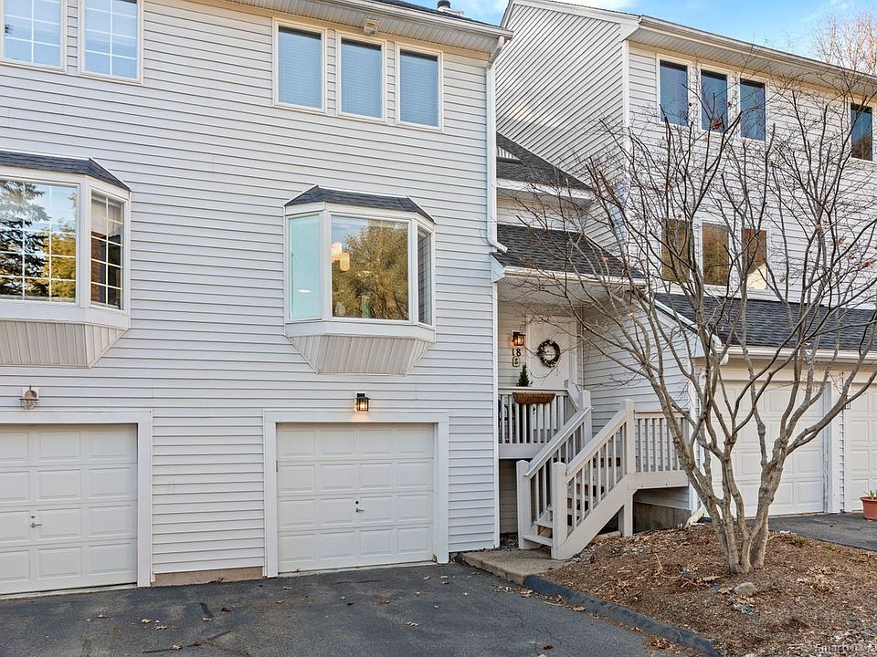Introducing 18 Camille Ln, a meticulously maintained and thoughtfully updated 2-bedroom, 2.5-bathroom townhouse in the highly sought-after Cantonbury Heights complex. Spanning over 1600 sq ft of comfortable living space, this charming abode welcomes you with fresh interior paint, new carpeting on the stairs, modern light fixtures, central AC, and more recent upgrades that make it truly turn-key ready. Step inside through the front door to be greeted by a sunlit foyer featuring a skylight, tile flooring, a convenient coat closet, and an elegantly appointed half bathroom adorned with crown molding and a new sink. Ascend to the main level where the kitchen shines with newer stainless steel appliances, a bay window, and ample cabinet storage space complemented by new plumbing to the sink. From there, move into the inviting dining area leading seamlessly into the cozy living room boasting a fireplace insert framed by a beautiful mantle. Dimmer lights set just the right ambiance while a glass door opens up to your private porch overlooking serene nature scenes. Ascending to the upper level, you are greeted by the first of the generously proportioned bedrooms on your left, boasting double closets and plush wall-to-wall carpeting. The upstairs hallway unveils convenient washer/dryer hook-ups complemented by a new dryer vent, leading to a full bathroom and linen closet for added functionality. Stealing the spotlight is the primary bedroom suite with its cathedral ceilings that dance with sunlight, an expansive walk-in closet offering attic access, and a full bathroom completing the upper level. The walk-out basement features updated 200 AMP electrical service, a newer gas water heater, ample storage solutions, and sliders guiding you to the serene rear yard sanctuary. Completing this charming property is a one-bay under-house garage providing additional storage space for all your needs. Don't miss out on this amazing opportunity and schedule your private tour today!