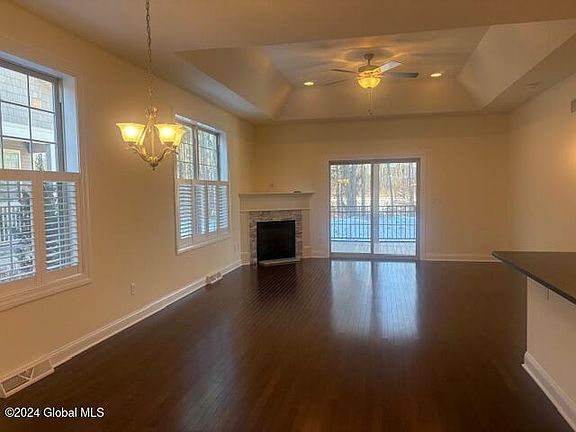 Delmar Pointe townhome. New build in 2021. Open floor plan, warm neutral colors. Nicely appointed. Recessed lighting, ceiling fans. Living area w/Gas fireplace, tray ceiling and Rich wood flooring. Slider to the screened porch with wooded views. Upgraded kitchen cabinets, pull out drawers, quartz counters and subway tile backsplash. Sitting counter space. 2 bedrooms, 2 full baths, quartz counter vanities. Primary bedroom features a generous walk-in closet. Primary bath offers a water closet, double vanity and large walk-in shower. 1st floor laundry room. Large clean, dry, warm basement with egress window. High ceilings and more! HOA dues $2,500.00 annually.