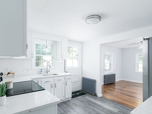 This beautifully renovated home blends modern upgrades with charming character. The kitchen features repurposed cabinets offering a bright white finish paired with sleek new quartz countertops and stainless steel appliances. Throughout the first floor, you’ll find gleaming hardwood floors that enhance the warmth and elegance of the space. The living area is accented by a cozy wood-burning fireplace, Adjacent to the main living space is a dedicated office, showcasing a striking brick accent wall that adds texture and a touch of style. 1st floor features (2) of the bedrooms each complimented with bead board walls creating a cozy atmosphere . Upstairs has (2) two additional bedrooms with plenty of closet space All in a neighborhood setting with almost an acre of land . Highlights : new heating system, young roof , replacement Harvey vinyl windows ,freshly painted interior, new flooring, updated bathrm .