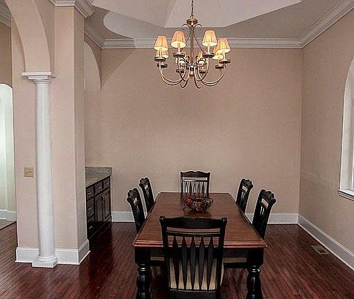 - DINING ROOM DESC: Wood Floor, Smooth Ceiling, Crown Mold, 9? Ceiling, Trey