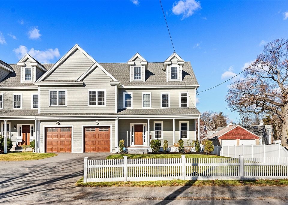 Classic 2020 built townhome with 3 levels of incredible living space located in the heart of downtown Woburn. This home features 3 beds/ 2.5 baths with a spacious & sunny foyer and direct entry from the garage. Enjoy a sophisticated & timeless design, exceptional millwork, and high quality finishes throughout. Expansive windows flood interiors with natural light and warmth. The spacious fireplace living room w/ picturesque views of the gorgeous landscape fenced in yard opens to the dining area creating an ideal flow for entertaining. The beautiful kitchen boasts a quartz island, stainless steel appliances, custom cabinetry and sliders leading to the composite deck. Upstairs, the primary suite features a full bathroom, nursery/office and generous walk-in closet. 2 additional bedrooms and laundry complete the 2nd level. The 3rd floor features a great room w/ amazing natural light and a separate room for an office. The unfinished walk-out basement is already plumbed for a future bath.