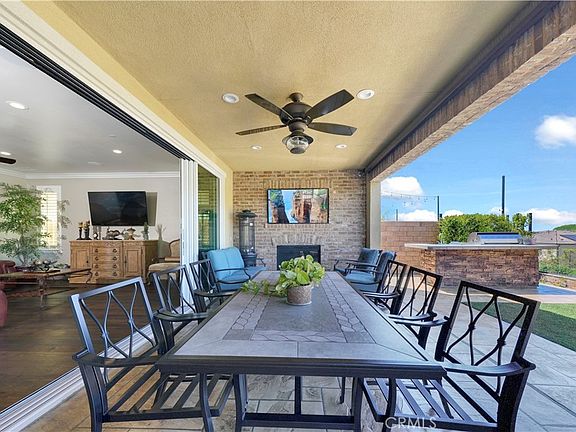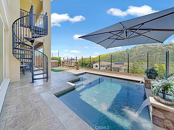 Welcome to your stunning Spanish Monterey-style home with panoramic views of rolling hills, city lights, and breathtaking sunsets. Built in 2018, this extensively enhanced two-story design showcases scenic hills and evening-light views and is located in the prestigious Skyridge community. Situated on a quiet cul-de-sac street, this magnificent flexible floor plan adds an optional 4th bedroom (if desired), which can be converted with approved city permits, which the owner can do the conversion (if needed). This family-friendly home offers an exceptional living experience with multiple biking and walking trails nearby. With Saddleback Mountain as a picturesque backdrop, Sky Ridge is conveniently located close to award-winning public schools, Whiting Ranch Wilderness Park, Trabuco Canyon, Lake Forest Sports Park, The Shops at Mission Viejo, Lake Mission Viejo, beaches, and freewaysThe property has no Mello-Roos and low HOA dues, making it an even more desirable investment. This beautiful 2-story home boasts spacious living space with many windows and a large, multi-panel sliding glass wall leading you to the California room for additional entertainment space for your guests. The beautiful traditional kitchen features a huge granite countertop and stainless-steel appliances, making it a chef's dream. The primary suite has a retreat space and a large balcony overlooking a tranquil view. The lavish primary suite reveals a spacious covered view deck. This stunning home has accounted for every detail, which offers full amenities and impressive CUSTOM OUTDOOR ENTERTAINMENT: A flow of indoor and outdoor California-style entertaining. You have easy access from the primary room to the outdoor spool (spa) via a beautiful custom metal spiral staircase, giving you convenient access to the spool with water feature accents and lighting. The drought-tolerant landscaping is on a smart drip system with low-voltage landscape lighting. The outdoor area also features an outdoor TV, surround sound, BBQ area, full home water purifier, security camera systems, and a finished garage with an epoxy floor. This stunning property is a must-see for luxury, comfort, and convenience. Take advantage of this incredible opportunity to own a piece of Skyridge's finest living. Schedule your private showing today and enjoy the Southern California lifestyle you've always dreamed of.
