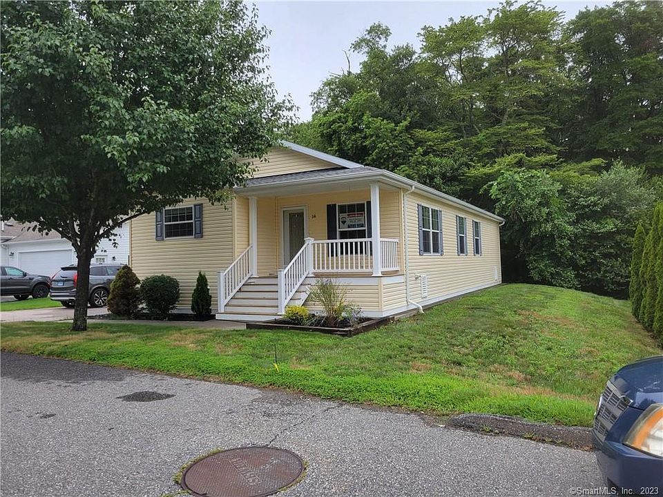 First time offered. This very nice front recessed entry manufactured home offers 3 bedroom, and 2 full baths. Located in charming Stonegate Village only minutes to Route 95, Mystic, shopping, major employers and all around attractions. This home has a large eat in kitchen, separate dining, good size living room. There is a separate laundry room with it's own wash sink. Home is heated by propane. Includes central air and shed. This particular site is set up for a future 2 car garage. Stonegate Village is an active 55 and over land leased community offering a recreation center, lawn care, snow removal and trash removal. Ground lease is $560 per month. Pets allowed with park owner approval. All buyers are subject to park approval.