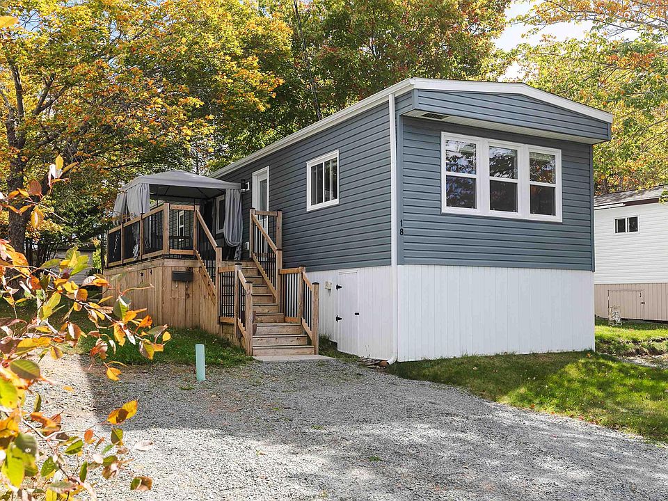 Welcome to 18 Commodore Avenue, a beautifully renovated 2-bedroom, 1-bath home that has been transformed from top to bottom. Featuring recently updated drywall, plywood walls, insulation, all-new windows, siding, and skirting, recessed lighting, newly constructed decks, a new back patio area, and ductless heat pump, this property is designed for comfortable and efficient living. The plumbing has been updated, and the electrical system has been completely upgraded with new wiring throughout. To top it all off, the home has just been professionally painted throughout, giving it a clean and refreshed finish. The kitchen boasts updated white cabinets, sleek countertops, and a sizeable island, complemented by stainless steel appliances, including a fridge, stove, dishwasher, and microwave range. The stunning bathroom features a soaker tub with a tiled back wall, a quartz countertop vanity, and a stackable washer/dryer. Enjoy your morning coffee or evening sunsets on the spacious deck, complete with your brand-new gazebo. A recently wired shed adds extra functionality to this exceptional home. With parking for two in front, great neighbours, and a quiet, picturesque, well-managed park surrounding you, this location has it all. Only 20 minutes to Dartmouth, 28 minutes to Halifax, and a mere 5 minutes to all major amenities—what more reason would you need to call 18 Commodore Avenue your next home? See link for virtual tour!