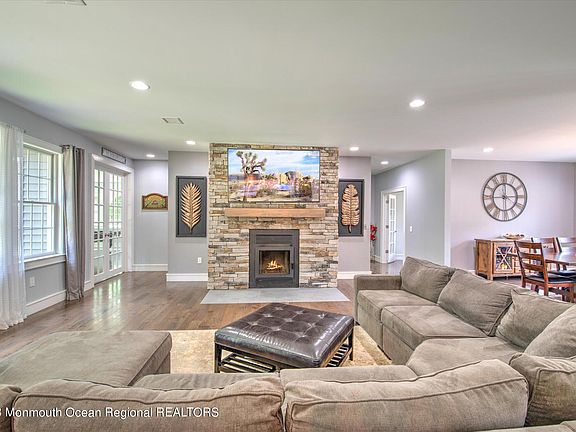 Welcome to this 5yr old stunning custom built 4 bedroom 4 full bath extended ranch situated on 3.5 acres at the end of cul-de-sac in desirable Manalapan. The attention to detail is stellar. Home features a Gourmet kitchen with quality craftsmanship cabinets, huge Quartz center island, lots of cabinet space & high end stainless steel appliance package. A true 'Chef's Delight'. Open Floor plan is accentuated by the stone wood burning zero clearance fireplace in the living room. Sunny conservatory is the perfect 'Game Room'. Spacious formal dining room adds to the wealth of space. Enjoy the indoor/outdoor living space with the screened in sunroom overlooking the private yard. 150 foot access to Millhurst Pond & enjoy kayaking. Retreat to the Primary Suite wing with an attached elegant bathroom complete with oversized shower, porcelain tiling, lovely freestanding whirlpool bathtub & large walk-in closet with a classic European flair. 3 more large bedrooms, 2 which have attached full baths. Mudroom leads into the 3 car attached garage with pull-down floored attic. Separate Office. Laundry Room. Covered Patio. 5" hardwood floors throughout the home. Anderson 400 series windows.15 zone sprinkler system. Integrated lights/smart home. French Doors. Transfer switch hook-up for generator. Close to great schools, shopping, restaurants & highways. This home will not disappoint!. A must see!!