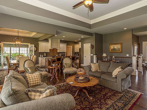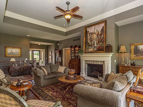 This beautiful custom-built ranch is located in a family-friendly neighborhood, close to Interstate 80 and TBK Sports Complex.The main level has hardwood floors, tray ceilings, and features a fireplace. Also on the main level are 2 bedrooms, 2 full baths and laundry. The kitchen features hardwood floors, quartz counters, tiled backsplash, stainless steel appliances and breakfast bar. Appliances stay with the home. The master bedroom is located on the main level and features carpet floors, tray ceiling, separate sitting area and walk-in closet. The attached master bath includes tile floors, poured marble counters and tiled shower. The finished lower level features a wet bar, family room, 2 bedrooms, full bath, workout area and storage area. Attached to the kitchen, you'll find a large sun room overlooking a patio and an immaculate professionally landscaped yard with irrigation. It abuts Pebble Creek Golf Course on hole number 1 with a view of the green and the pond. Insulated and heated 3 car garage.
