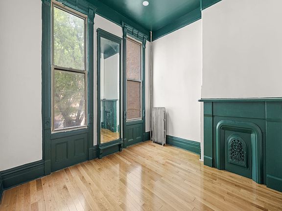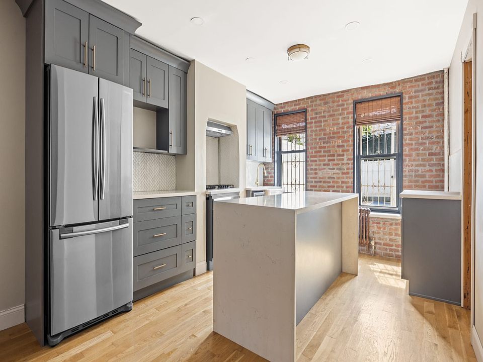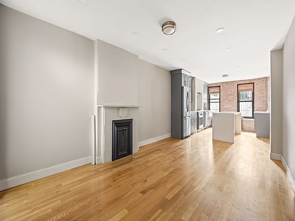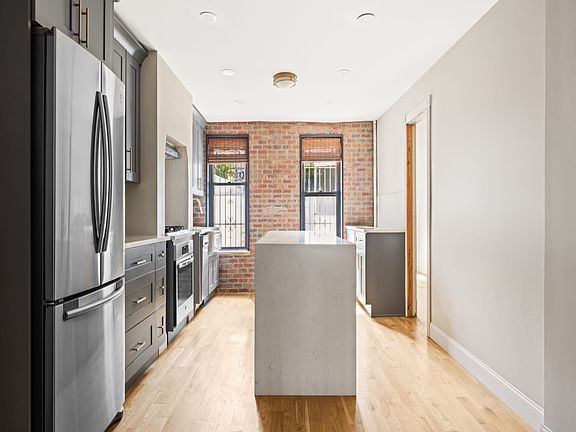 Bushwick Duplex with Private Backyard 2 Bedrooms + 2 Home Offices | 1.5 Bathrooms | Private Backyard | Washer/Dryer Spacious duplex with original details and modern upgrades. - Garden Level Large under-stoop storage area for bikes, strollers, and more Foyer with coat and shoe storage Bright living room with decorative fireplace Renovated kitchen: porcelain farmhouse sink, dishwasher, French door refrigerator, center island, extensive counter and cabinet space, USB outlets Pantry closet Bonus area off kitchen for home office or breakfast bar Private backyard with barbecue space and basketball hoop Half bathroom with pocket door Access to basement with in-unit washer/dryer and additional storage - Second Floor Full bathroom with window, closet, and tub/shower combo Bedroom 1: southeast-facing, decorative fireplace, original mirror, large closet Hallway with two extra closets Bedroom 2: decorative fireplace, original mirror, large closet, attached bonus room/home office with wallpaper accent Location Prime Bushwick near The Steel Mill, The Evergreen, and Salud Bar & Grill Close to J train at Halsey Street and ample street parking Pets allowed