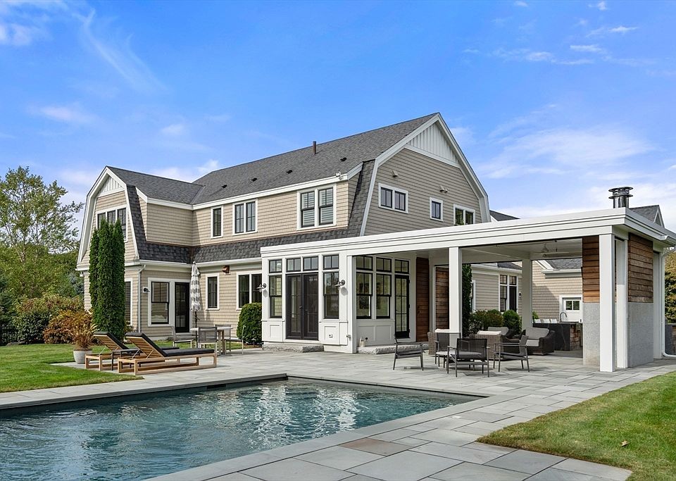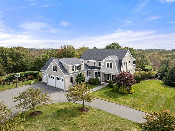 Nestled on a private cul-de-sac, this hilltop home is surrounded by conservation land and has distant ocean views. Constructed in 2013 to the highest standard, the home has been improved and enhanced by the current owners. No expense has been spared to create this masterpiece. Exquisite woodwork throughout, elegant appointments, gorgeous floors and surprises at every turn. The main level has living room with gas fireplace, formal dining room, home office, chef's kitchen with requisite high-end appliances, island and breakfast room. Custom outfitted mud room has laundry room. The second level has primary suite with double closets and chic marble bath. Three en-suite bedrooms and upstairs laundry. The finished lower level has home gym and games room/family room. The outdoor kitchen is outfitted with s/s appliances, TV room with fireplace, retractable screens and half bath. Heated gunite pool with bluestone surround. Three car garage with unfinished space above. State-of-the-art systems.
