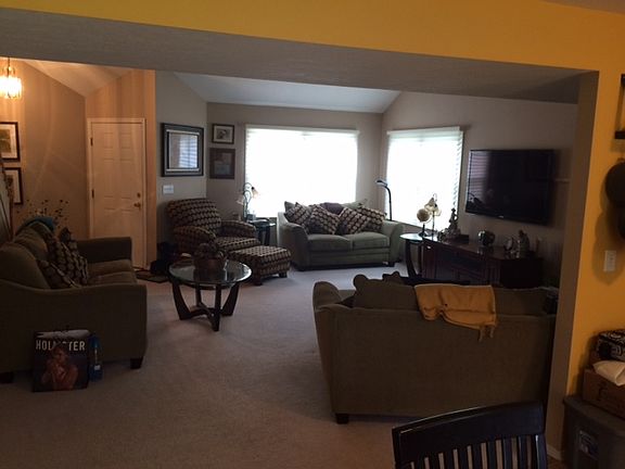 Realtors tell me the home appears to be staged as it is professionally painted and updated. 3 bedrooms with the master on the first floor. Open floor plan with high vaulted ceilings. 2 full baths with a rough out in the basement for a 3rd. Bedrooms meant for king size beds! Lots of room. Private drive is very quiet and safe. Back yard backs up to 12 acres of private property with large beautiful trees! Lowest HOA fee in the county includes all lawn and snow service! Call, text or email for a showing.