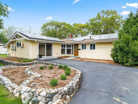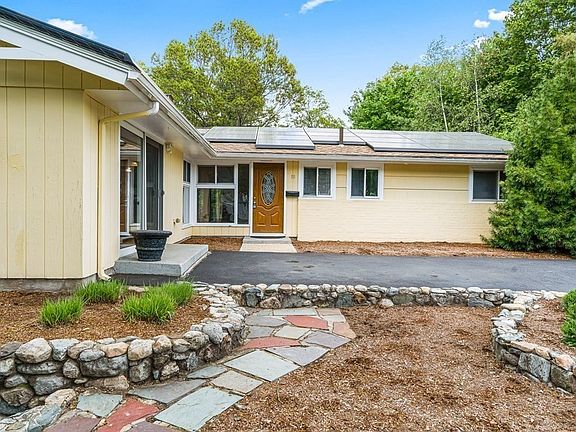 Picturesque 3-bedroom, 2 bath updated ranch nestled on a lovely half acre lot on a quiet, low traffic street. This renovated, low-maintenance home offers easy one-floor living, with a young, modern eat-in kitchen, a large adjacent dining room, a living room overlooking the largest back yard in the neighborhood, and a brand-new master suite. The just finished master suite offers a custom walk-in closet, energizing morning sun, and a brand new ensuite bath. The eat-in kitchen has gorgeous granite counters, SS appliances, and one of the only gas ranges in Upper Framingham, making this kitchen the perfect spot for the adventurous and enthusiastic chef. Whip up your favorite dish while entertaining with your guests in the large adjacent dining room or outside on the patio. Settle in next to the fireplace or watch tv in the spacious living room overlooking the magnificently manicured back yard. Energy efficient upgrades throughout and FIFTEEN YEARS OF PRE-PAID SOLAR PANELS. OVER $25K VALUE.