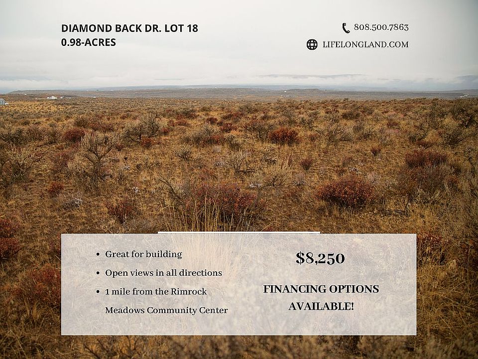 - LEGAL DESCRIPTION: LOT 18; BLK. 8; RIMROCK MEADOWS #2 - ELEVATION: Approx 1,600 ft - ROAD ACCESS: HOA maintained dirt road access - LOT SIZE: 0.98-acres - ANNUAL TAXES: $52.75 - HOA: Annual dues $220 Diamond Back Dr Lot 18 is our newest property in the recreational and residential community of Rimrock Meadows. Located in Douglas County in Washington State, this 0.98-acre property is almost entirely flat making those open views in all directions even more incredible. Surrounded by remarkable sagebrush, this easily walkable lot is ideal for fully enjoying the camping/RV experience or, if you’re looking to stay, it’s great for building. With its dirt/gravel road you will find easy access to and from the property.