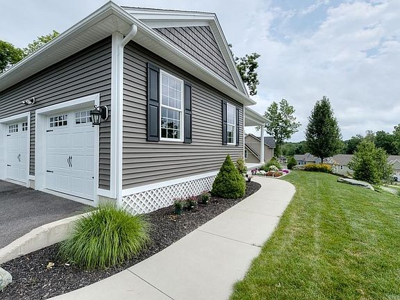 This beautiful Contemporary Ranch is situated high on a knoll in a "Newer" neighborhood and is ready for you to move right in! Enjoy the incredible views, lush landscaping and privacy this lot has to offer. The first floor living area has a great open floor plan with large windows that allow natural sunlight to fill the rooms. The living room offers a fireplace with accent lighting and is open to the Dining Room. Hardwood flooring and wainscoting through out. The Gourmet kitchen has an 8' center island, pantry, stainless steel appliances, plenty of cabinet space, gorgeous granite counter tops, dining area and access to the large deck. The master bedroom has a walk in closet with custom organizer and a master bath with double vanity & tiled shower. The nice sized bedrooms have ceiling fans and ample closet space. The family room in the basement has recently been finished with ship lap walls, w/w carpeting, custom built in cabinets and counter space, closet. Plenty of storage.