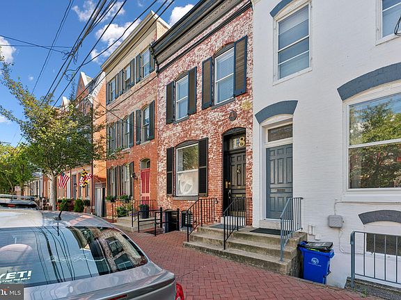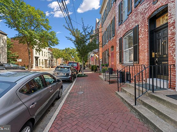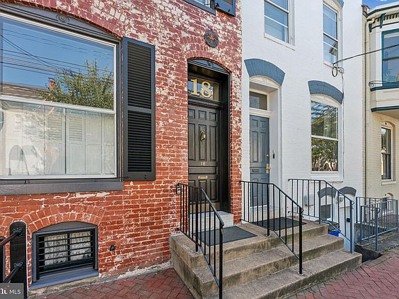 OFFER DEADLINE SUNDAY 9/8 AT 5 PM. Discover a piece of Frederick's history with this charming 3-bedroom, 1.5-bathroom rowhome, beautifully updated and nestled in the heart of Historic Downtown Frederick. Built in 1890, this all-brick row house offers a blend of classic character and modern convenience. Enjoy the convenience of nearby dining, unique shopping, and the scenic Carroll Creek with its walking paths and vibrant community events. Step inside to find gleaming hardwood floors throughout, complemented by two fireplaces in the living and dining rooms. The spacious kitchen boasts custom soapstone countertops with a stylish backsplash, ample room for dining, and a second stairway leading to the upper floor. On the second level, you'll find three generously sized bedrooms, each with hardwood flooring, and a full bath featuring a vintage clawfoot tub. One bedroom even includes a private balcony overlooking the beautifully landscaped, partially fenced backyard. Additional features include a dual zone HVAC system, an 80-gallon hot water heater, updated electric and new recessed lights in basement, new ceiling fans, neutral paint, metal roof, and lovely kitchen and bathroom spaces (both toilets replaced recently). The lower level offers an unfinished basement with plenty of storage space and a poured concrete floor. Outside, enjoy the brick patio and spacious backyard, perfect for relaxing and entertaining. This home combines historic charm with modern updates in a prime location. Don't miss your chance to own this unique property—call today to schedule a viewing! Do you need garage parking? A garage just opened up right by this home and is being held available over the weekend for the potential new owner at a rate of $150/month. Listing agent will provide details to buyer agents.