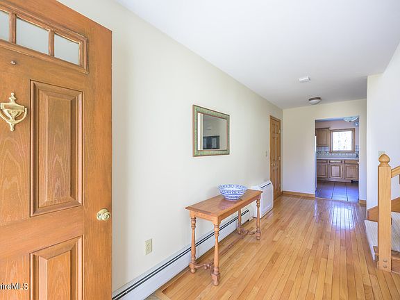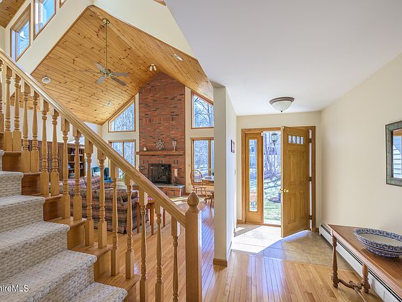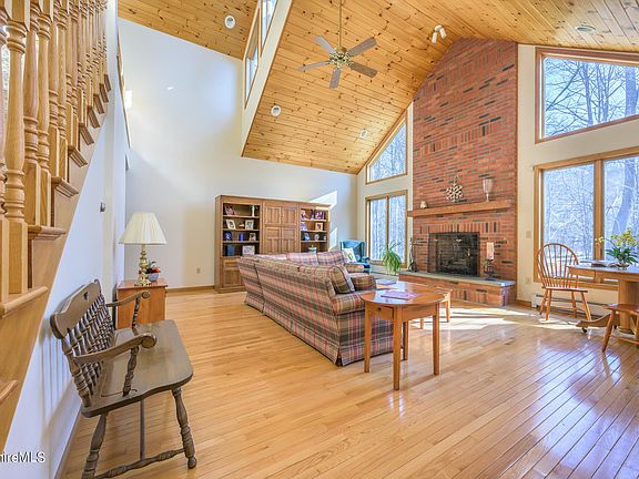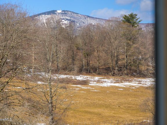 First time offered! Custom built, light filled contemporary with highly sought-after mountain and bucolic views. The living room features cathedral ceiling, wood floors, two-story fireplace, and heat pump. Off the living room is the dining room with slider to deck looking directly west toward the state's highest peak, Mt. Greylock. The kitchen is well appointed with great counter and cabinet space and a large walk-in pantry. Steps away is the large mudroom with access to the attached two car garage. Two carpeted bedrooms, a full bath, and very convenient storage complete the main level. The generously sized primary suite is on the upper level, with even better views! The cherry on top is a little brook which runs through the back of the property. Roof replaced 2020. This is a MUST SEE. The added bonus is the basement area, custom constructed to have unobstructed sightlines, perfect for a variety of recreation, entertaining, and hobby activities.