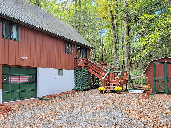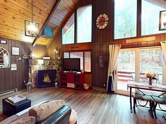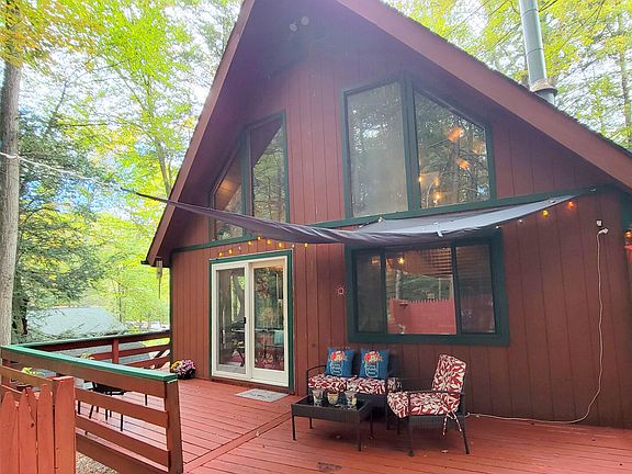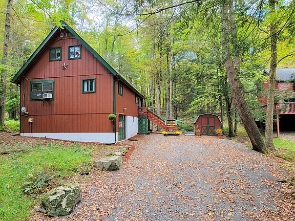 This NEWLY UPDATED chalet is EXACTLY what you've been looking for! Located in The Hideout, one of Northeastern PA's favorite gold star communities, this 2+ bed, 2 bath home is the perfect Pocono getaway with a huge deck overlooking the oversized 0.8-acre lot on a cul-de-sac. Featuring a tastefully updated kitchen w/granite counters, it also has been upgraded w/brand new humidity & moisture resistant laminate flooring throughout the home. The living/dining room has cathedral ceilings & a stone-accented propane fireplace. Large loft w/built-in bunk beds is great for extra sleeping space for your guests! The lower level has a family room w/bar, full bath, & laundry. 1 car garage can be converted to more living space! Cute shed for extra storage. New water heater; roof is only 6 yrs old!