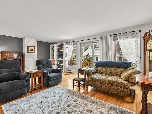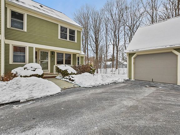 Welcome to Fieldstone Condominiums! This beautiful and meticulously maintained townhouse offers a picturesque setting as well as an open floor plan. Enter into a bright and sunny living room with custom built-in shelving and bench, gleaming hardwood floors, and glass sliders leading to the large deck. The dining room has ceramic tile floors and flows seamlessly into the stunning cathedral kitchen, featuring granite counters, white cabinets, stainless appliances and a beautiful, oversized window that brings in an abundance of natural light and offers pretty, wooded views. Upstairs, you'll find two generous bedrooms, a full, updated bath, and a fantastic loft-bonus room with a skylight—perfect for a home office or additional living space. A convenient and nicely updated half bath is located on the main level. Additional updates include a new oil burner installed in 2021. A detached garage right outside your front door and ample off-street parking complete this fantastic home.