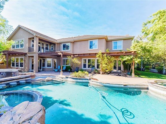 A resort style huge house nested in a corner Lot . Doble Gated Oak Knoll Summit in Coto de caza. The high ceiling floor plan provides ultimate functionality for vacation style living . Private downstairs office with glass french doors & en-suite main floor bedroom while the oversized great room seamlessly connects the kitchen, family room & chef's kitchen featuring a contemporary island, & stainless steel appliances complete the lower level. The Elegant upstairs master suite with , fireplace & balcony to enjoy morning coffee & evening breezes overlooking magnificent pool with serene waterfalls & lush landscaping. master bath with walk-in shower, two separate vanities, large oval jetted tub w/ expansive closet room & adjacent Workout Room plus huge secondary ensuite bedrooms. Amazing backyard premier design blends perfectly with mountain view with rock pool & spa , built in BBQ and fireplace! Rare 4 car garage .