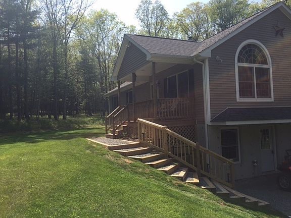 Nestled on 5 acres on a quiet cul de sac among mature trees provides a private and secluded setting for this two bed, two bath custom Westchester Modular ranch with hardwood floors. This quality constructed home is minutes from the Delaware River and the town of Narrowsburg, all the amenities of the community are close at hand to be utilized-fine dining and shopping,art and entertainment, and river activities of kayaking, fishing, hiking, and swimming. The cathedral ceiling of the great room with Palladian styled windows allows lots of sunlight to fill the kitchen, living, and dining space for total enjoyment. Walk through glass sliders to your deck to relax or cook on the BBQ or just take in some nature and bird watching from your woods! The cozy front porch provides space for sheltered R&R. The walk out basement includes a workshop and room to finish for that entertainment center. You can't buy land and build a quality home at this price today! Call for your appointment today. Just 2 hrs from NYC. Come live the dream in the Catskills!