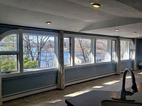 Enjoy spectacular water views of Lake Waushacum from this updated and bright raised ranch! 10' right of way access to the lake for boat dock and right around the corner from the town beach! Modern, open floorplan includes updated kitchen, dining area and living room with cozy stone fireplace. Wall to wall window provides panoramic views! Watch the sun set on the large side deck with water views or lounge in the breezy three season room. Two bedrooms and bath on main level, and private master bedroom with updated master bath on second level. Small finished room in lower level could be used for home office or additional storage. Professionally installed, waterproof basement with full french drain, water barrier and sump pump. Updates include- new oil tank, heating sytem with multiple zones, water heater, 200 amp electrial panel and new plumbing!