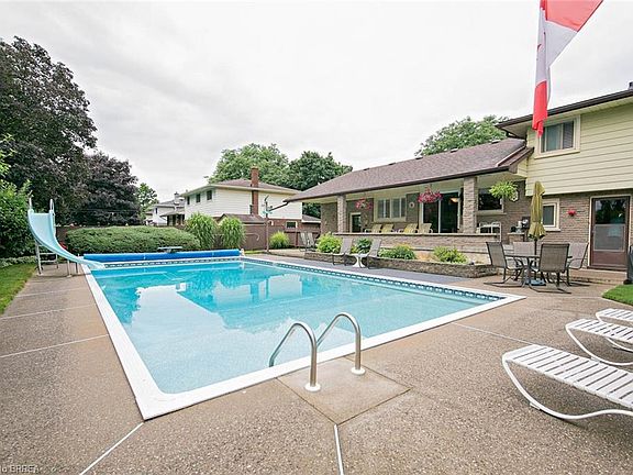 Welcome home to 18 Hanson Boulevard, in Brantford's sought after Grand Woodlands area (North End). The lot size is an incredible 77 foot frontage with a depth of 111 feet. As you pull into the 4 car driveway you'll immediately be taken back by the beautiful landscaping out front of the home, matured grounds and full irrigation system. The one car garage with man door to backyard take you again to a meticulously kept and well cared for oasis. The 6 x 30 foot covered patio area overlooks the 20 x 40 Inground pool, a pool change house, plus enclosed pool heater area, and plenty of space for guests, parties, or for you to enjoy some time away from the world. Entering inside you'll come into a half bath area to the family area with a gas fireplace, your office or forth bedroom area. Head up a half level and you'll enter into the comfortable foyer and main living room and dining room location, kitchen area with plenty of cupboard space and built in appliances. The kitchen has a patio door offering easy access to back yard under the covered patio. Upstairs is the master bedroom, two additional bedrooms and the four piece bathroom. In the basement level, you'll find a large recreation room, another multi-use workroom space with work bench, laundry area and a one piece shower, additional storage under family room/office area, no shortage of storage space. Really well cared for property. One owner home. Shingles (2017) eaves troughs (2015) driveway and curbs (2007)