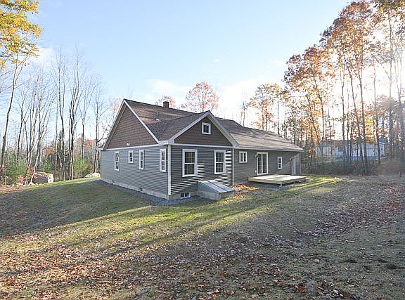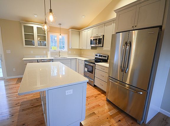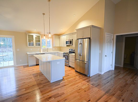 Layout includes an open concept of kitchen and living room with cathedral ceilings, Master bedroom with full bath and two bedrooms with full guest bath and first floor laundry. Hardwood flooring, quartz countertops, GE Profile appliances and other nice amenities. Attached finished garage with storage above and full basement. Front porch, rear deck and ample lawn area for outdoor living. Located in quiet sub-division.