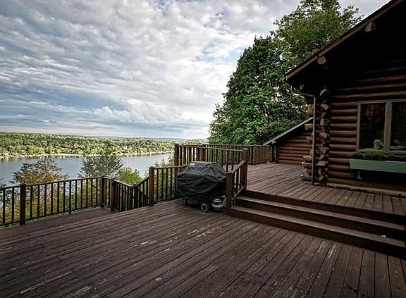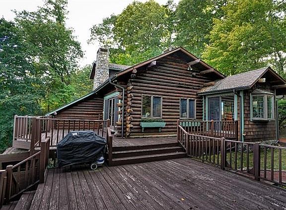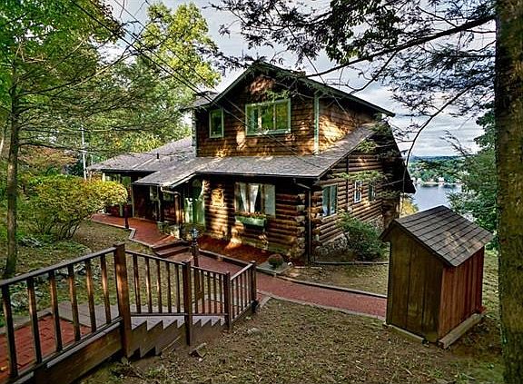 CANDLEWOOD LAKE- Where Eagles soar! Mountaintop setting w/30 mile views of Lake & Countryside. 900sq ft deck/Hot Tub/Conversation Seating Area/Outdoor Shower. Room for pool. Absolutely charming Log/Lodge home. Vaulted beamed LR w/massive stone fireplace. Stunning bathrooms. Square footage includes finished studio/bonus room w/ Lake views-(325 sq ft over garage w/bath). Technically 175'Direct Waterfront but steep to water-would require tram. Candlewood Isle Amenities include full service Clubhouse-Community Center/boat Docks/Tennis Courts/Basketball Court/Bocce Courts & Summer Camp