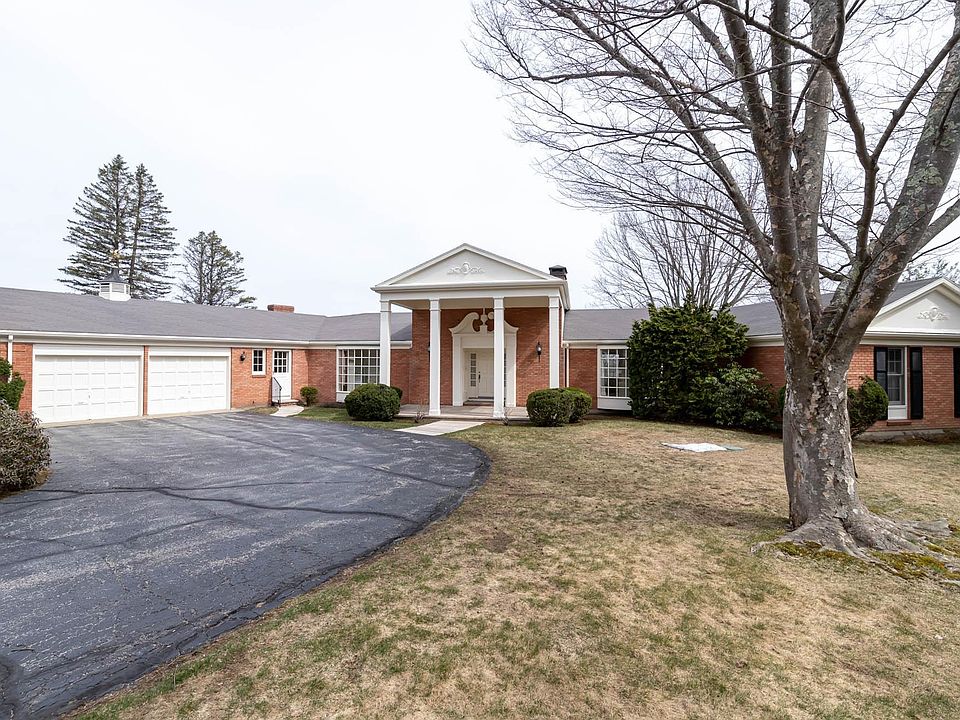 Location, Location, Location! Close to all major highways and shopping. Award-winning Bedford school system. One owner. This custom-built Sholtz-designed brickfront Colonial ranch is beautifully situated on a hilltop with seasonal views of the Manchester skyline. The 1970s kitchen and bathrooms need updating and some window replacement is needed. Hardwood floors (carpeted for 52 years) will need refinishing. With four bedrooms, the bedroom wing could be reconfigured to create a larger master bath and closet space. The stunning elevated patio with its curved granite staircase is a wow factor as is the size of the walkout basement with brick fireplace and two sliders. Home is being sold As-Is. Showings start Saturday, April 15.