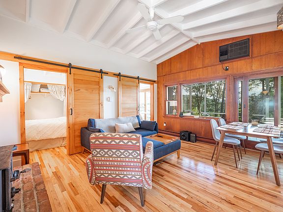 This furnished mid century modern bungalow is all about the view, sunrises and indoor/outdoor continuity between the groovy comfort of its interior spaces and the huge treehouse-like screened-in and open deck spaces adjacent to a dense woodland. Watch the sunrise from the master bedroom through your oversized slider or from the kitchen through a second slider and bay windows. Feel the outdoor air through the 6 1/2'x3' serving window directly over the cooking area. Fully updated bedrooms, bath, and kitchen with top quality and carefully selected details make the space pleasing to the eye and mind. You will be amazed by the peaceful seclusion, plus sights and sounds of birds and other nearby wildlife, and by lake views during the day. The deck has a charcoal grill, corner seating, string lights and a dart board for entertaining, and the inside + outside dining areas each seat 6. Relax and unwind with a book or sketchpad or visit nearby Squantz or Ball ponds for a paddle with the 2 kayaks and rowboat included. Rent is $3950 per monthly term. All utilities included. Internet WiFi included. Garbage removal included. No pets of any kind. No smoking inside the house. No parties or large events at the house. No unregistered tenants at property. Parking for 3 cars included. Use of kayaks and rowboat included.