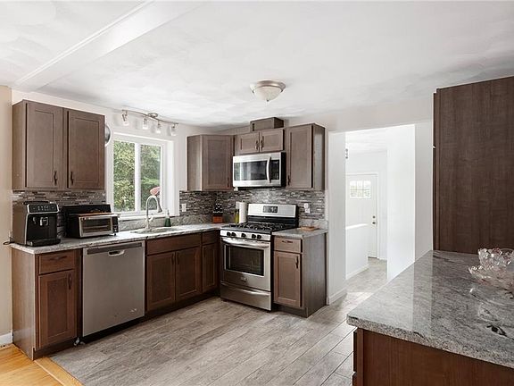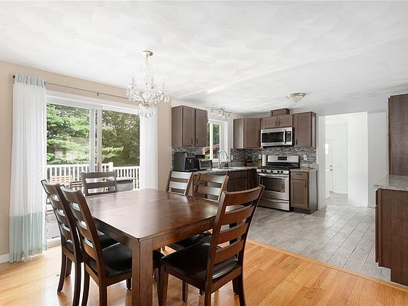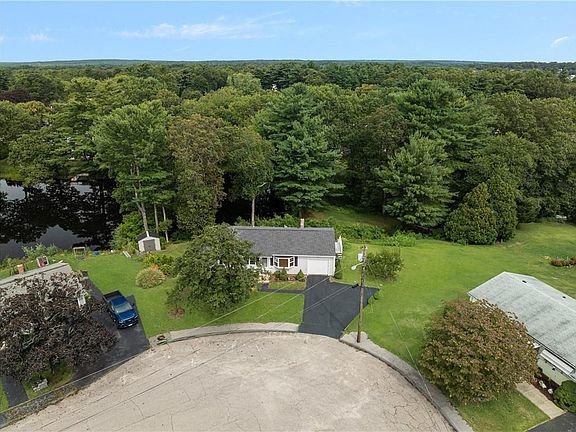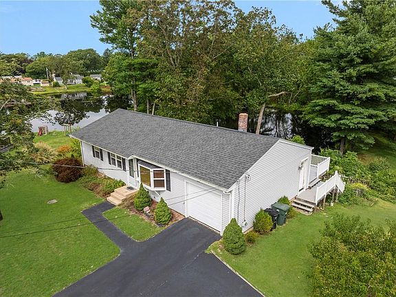 Tucked away on a cul-de-sac along Rope Walk Pond, this 3-bedroom waterfront ranch offers one-level living at its best. The open floor plan connects the living and dining areas, creating a bright and inviting flow. In the kitchen, granite counters, stainless steel appliances, and newer cabinetry combine style and function. Just off the dining area, a slider leads to an expansive deck overlooking the pond, the perfect spot for morning coffee or evening relaxation. A finished walkout basement provides versatile bonus space, while hardwood floors, central air, vinyl siding, a newer roof, and an attached garage add to the comfort and convenience. No flood insurance required. Move-in ready, this home balances comfort, style, and convenience in a sought-after setting.