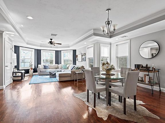 Prime location!. This 3bed/2bath duplex condo with 2 car off-street parking is located steps from vibrant Roslindale Village and Public Transportation. Entering the unit you are greeted with gleaming hardwood floors and a large open concept living/dining area featuring a tray ceiling and gorgeous crown molding. The kitchen and living area is separated by a large peninsula perfect for casual dining. The kitchen is equipped with stainless steel appliances, under & over cabinet lighting, and soft-close cabinets. Down the hall, you will find 2 bedrooms and 1 full bath. On the second floor, you will find the master suite. A large bedroom with a custom walk-in closet is just across from your huge master bathroom. LED lighting throughout, central air, and in-unit laundry complete the interior of this amazing property. Extras include private storage in the basement and a fenced in backyard with a patio. This property has been well cared for by the current owners and it show