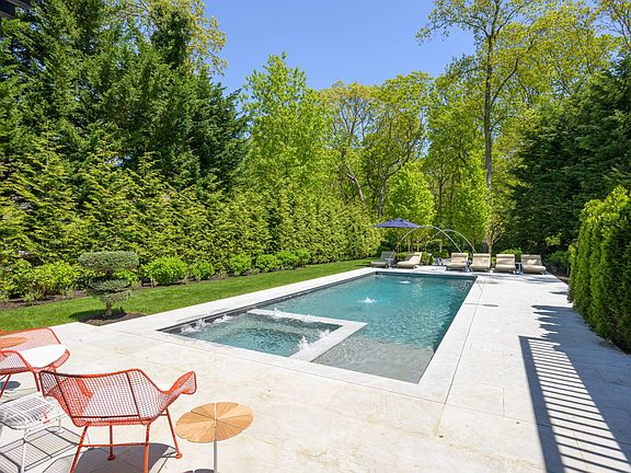 Rental Registration #: RP250761 Set on over a third of an acre, this exceptional residence has been fully renovated with modern interiors and amenities throughout. With ample privacy and a curated design concept, this exceptional property provides a tranquil setting alongside highly desirable amenities including heated saltwater pool with an inset spa, firepit area, plus well-equipped gym. The home offers an ensuite primary bedroom with king bed and a noteworthy full bath, 2 guest bedrooms are joined by a shared bathroom, and a powder room is convenient for guests while entertaining. The fully-equipped kitchen presents top-of-the-line stainless steel appliances, incorporated marble backsplash, and 2" countertops. The island is a focal point upon entry and can seat 8, creating a breathtaking space for entertaining, overlooking the park-like backyard backdrop, with additional easy flow to the back deck for outside grilling and dining alfresco with similar views. The impeccable home showcases a precise design concept that seamlessly blends the beauty of the outdoors with an exquisitely crafted interior, an open plan kitchen, living and dining area. The primary portion of the residence features ample living space with contemporary, clean finishes. Design elements throughout include white oak floors, walls wrapped in rift and quartered white oak, and custom carpentry, cabinets, built-ins and vanities. Accessed from the main level living area, a mahogany terrace with dining spaces overlooks the backyard. Extensive hardscaping and specimen plantings highlight the pool, spa, and arbor with fire pit area. Additional amenities include a retractable pool cover, Jee-O outdoor shower, backyard Sonos and WiFi. The waterfront neighborhood offers waterfront sunsets from a covered gazebo - or head to Towd Point Beach less than one mile away. For wellness and health, the gym is equipped with a Peloton, an arc trainer, and full squat rack. This property is centrally located and convenient to Southampton village, Sag Harbor, and Bridgehampton. Golf courses, world-class equine facilities, wineries, and ocean beaches are also just moments away.