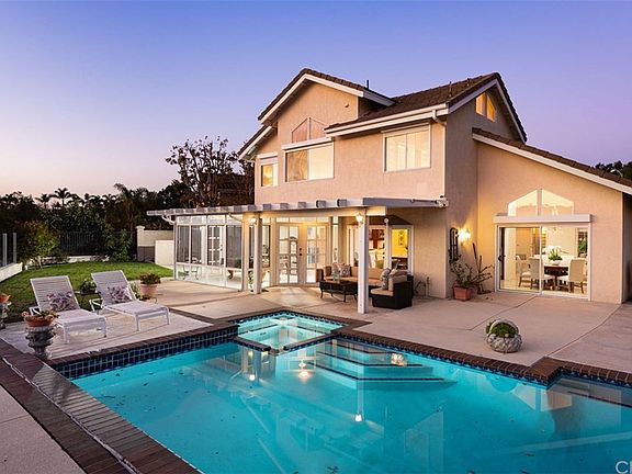 Enjoy spectacular panoramic mountain, city lights and sunset views from this expanded estate perched high up on an approximately 11,000 sq ft flat lot with sparkling pool & spa. Enter through a private courtyard to towering 2 story ceilings and massive windows that capture the beautiful views and allow abundant natural light. The grand living room featuring marble floors and custom rod iron staircase connects to the formal dinning room. A MAIN FLOOR guest quarters with its own full bath, office and separate entry connects the living room and family room. Enjoy forever views from the family room with custom marble fireplace, custom built-ins featuring a wet bar and center island that connects to the gourmet kitchen with custom cabinetry, granite counter tops, custom stone backsplash and a breakfast nook with a bay window looking out to the gorgeous backyard with views. Ascend to the second floor and enter the master suite through double doors with soaring ceilings and more massive windows to capture the breath-taking sunset views. An impressive dressing room within the master suite features custom built-in organizers and an exercise area with more views to enjoy! A 2nd master bedroom with vaulted ceiling on the upper level features a large walk-in closet, a retreat and an ensuite full bathroom. 2 other guest bedrooms and a 3rd full bathroom are located on the upper level. Enjoy the convenience of an oversized 4-car garage and a separate laundry room. Newer HVAC & pool heater.