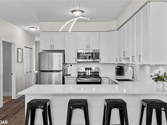 This modern, nearly-new townhouse bungalow—less than three years old!—is nestled in Orillia's highly sought-after North end, North Lake community, offering the perfect blend of convenience and tranquility. With 2+1 bedrooms and 2 full bathrooms this home boasts a luxurious living experience that exudes comfort and sophistication. Enjoy the open-concept kitchen, dining, and living room area filled with an abundance of natural light, leading to an upgraded upper deck with stunning forest views. The modern kitchen is the heart of the home and features quartz countertops, stainless steel appliances, ample storage and counter space, and is perfectly designed for seamless entertaining and gathering with friends and family. The spacious master bedroom offers a serene forest view, a walk-in closet, and a large ensuite bathroom with walk-in shower. The basement includes a large family and recreation room, a bonus room, a rough-in for a bathroom ready to be customized, and a shiplap-surrounded fireplace for warmth and comfort. With plentiful visitor parking and immediate access to the Lightfoot Trail, parks, beaches, highways, shopping, groceries, and more, this home epitomizes the perfect blend of modern convenience and comfort.