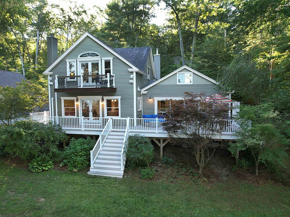 Welcome to this stunning waterfront home with nearly 200 feet of shoreline (including your own sandy area to easily walk in to the water) on Angle Pond! Being fully recreational, whether you want to swim, fish, kayak, boat or waterski, there is something for everyone. This home has been remodeled overtime from a 1950s camp to a custom three bedroom, two bathroom year-round home with hardwood floors throughout. The first floor features a kitchen with high-end stainless steel appliances, including a six-burner Thermador gas range and granite countertops, a living room overlooking the wraparound porch and with loft space above, family room with wood stove, bedroom, office space and full bathroom. The second floor provides the primary bedroom with double closets (and balcony overlooking the lake!), the third bedroom, the second full bathroom and laundry. Entertain friends and family on the deck, in the level, spacious yard complete with firepit, or along the lake front. Park your car in the detached 2 car garage and store the boat alongside, or make use of the remaining undeveloped land on this lot. The basement provides plenty of room for extra storage. Must be seen in person to appreciate the detailed finish work. This is an irresistible opportunity to own on the water in a wonderful community!