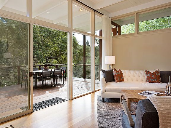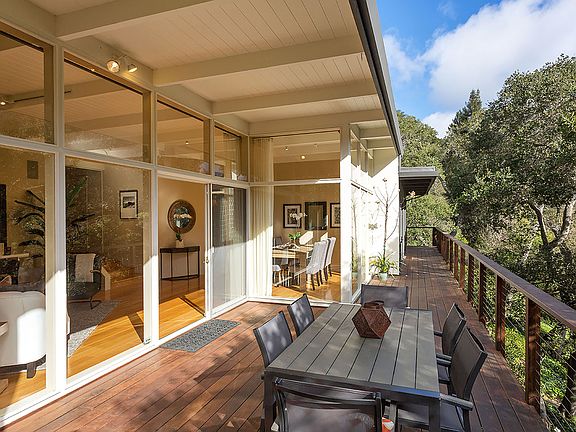 Fabulous Mid-Century Contemporary w/flexible open floor plan, chef's kitchen, big master suite, lpe deck, elevator, walls of glass, verdant treescape and peaceful private setting on large wooded lot. This stunning home also includes a family rm and extensive storage. This is a perfect 10!