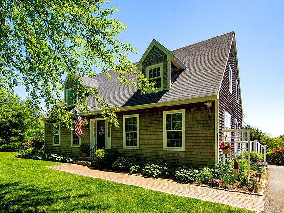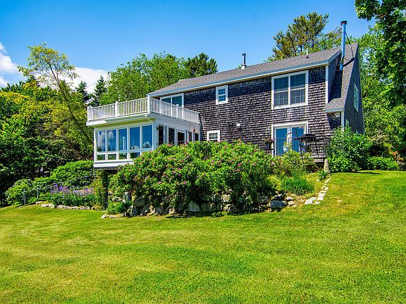 Welcome to this charming 2001 meticulously maintained Cape located on a private cul de sac with only three residences. Offering beautiful distant views of Blue Hill Bay, it is conveniently close to all the amenities Blue Hill has to offer. The house features three spacious bedrooms and three full baths, including a primary en-suite. The open eat-in kitchen and dining area includes a cozy propane fireplace, and the living area is equipped with a wood stove. Off the kitchen, there is  also an attached three-season sun porch overlooking the gardens and meadow, as well as an open deck with water views. The full unfinished walk-out basement offers a workshop and significant storage space. Surrounded by gorgeous landscaping including lupine, lilacs, 100+ year old Linden tree, and many other perennial's, this property is a MUST SEE!