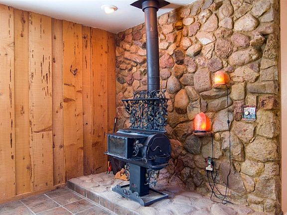 - LIVING ROOM: Wood Stove, Blinds, Ceiling Fans, French Door