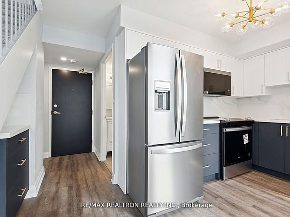 Step into this fully renovated and spacious 2-bedroom plus den, 3-bathroom loft where every detail has been thoughtfully redesigned from top to bottom. This one-of-a-kind condo includes one underground parking spot and one storage locker for added convenience. Inside, you'll find over 1,400 square feet of stylish living space featuring luxury waterproof vinyl plank flooring throughout, custom built-in cabinetry, and a chic carpeted stair runner that adds warmth and elegance. The open-concept main level is anchored by a chef-inspired kitchen with full-sized stainless steel appliances (covered by an extended 5-year warranty), quartz countertops and backsplash, and designer LED lighting and sconces that create an inviting ambiance. Each of the three spa-like bathrooms is finished with premium Italian porcelain tile, floating vanities, and high-end fixtures, offering a sense of tranquility and refinement. The expansive primary suite features a walk-in closet, a beautifully appointed ensuite, and a private balcony perfect for your morning coffee or evening wind-down. A second balcony off the kitchen and dining area is ideal for outdoor dining, entertaining, or a quiet yoga session. The main-floor den can easily function as a third bedroom, home office, or guest room depending on your needs. Floor-to-ceiling south-facing windows flood the unit with natural light throughout the day. Located in a vibrant, walkable neighborhood with a Walk Score of 97, you're just steps to TTC, grocery stores, cafes, restaurants, parks, schools, daycare, pharmacies, medical clinics, and more. This turnkey home offers a rare blend of luxury, comfort, and urban convenience. Some photos have been virtually staged. Maintenance fees include all utilities except hydro.