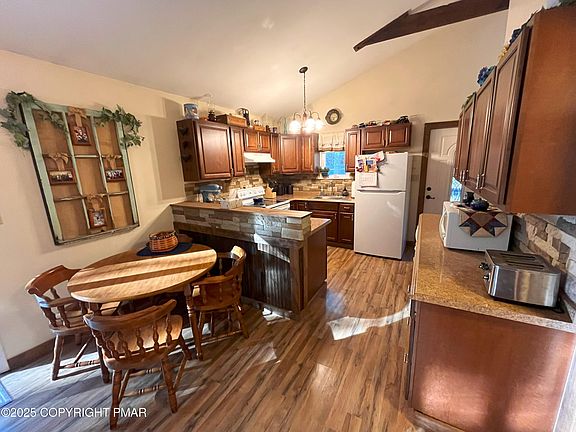 BEAUTIFUL 2 bed / 1 bath Ranch w/ DUCTLESS HEATING & COOLING, 2 car detached GARAGE, & oversized (RV-sized) CARPORT for sale on a SECLUDED 1.22 acre lot on a CUL-DE-SAC road for sale in Pleasant Valley West! The charming home features a great room w/ vaulted ceilings, sleek hard surface flooring, & a wonderful open concept design perfect for spending time w/ family & friends! The kitchen showcases ample counterspace w/ Airstone backsplash & a separate exit to the wraparound deck! Convenient primary bedroom laundry area. Stay cool in the summer & warm in the winter with high efficiency split units! Be sure to soak up the gorgeous surroundings on the sprawling wraparound deck. Generac 11kW whole house generator w/ auto transfer switch & hydronic electric baseboards as secondary heat source provide peace of mind. Plenty of parking with the 2 car detached garage w/ 50 amp electric service & 22'x44' steel built carport. Upgraded 200 amp electrical panel in the home! Unique cottage/storage building in the rear of the property with electric heat! Relax at Pleasant Valley West's lake, beach, & pavilion! Minutes to hiking, biking, rafting, Hickory Run State Park, downtown Jim Thorpe, & more! See today!