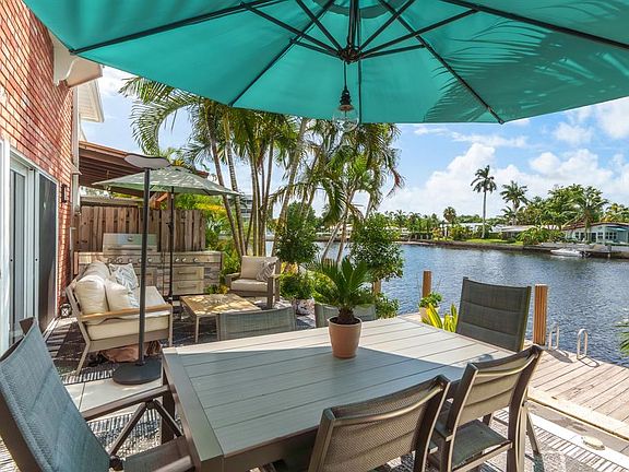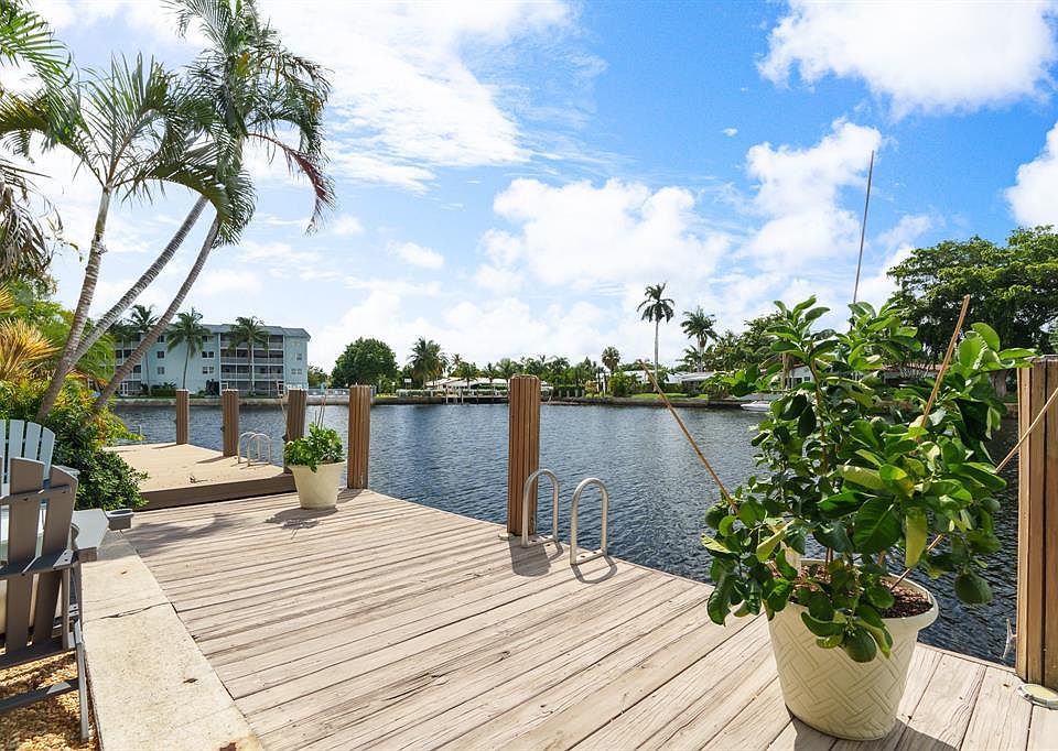 Beautifully situated at the water's edge overlooking the wide Middle River, this 2-bedroom townhome offers quiet living yet within an easy 5-minute walk to Wilton Drive. Expansive glass throughout brings in abundant sunshine to this home which features a striking Italian kitchen with gas cooktop and high-end appliances, porcelain and bamboo floors, spacious bedrooms with impressive storage. Countless entertaining options with a private front courtyard, an outdoor kitchen with both a patio and even a dock for your boat. Other highlights include the carport with secure storage, a separate storage shed and pull downstairs for attic access. The association offers a heated pool, clubhouse, dog park and a guest parking lot. Impact glass, new Rheem AC and new roof 2021, new electrical panel.