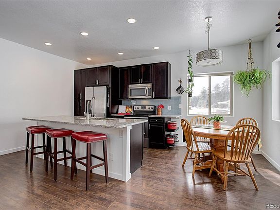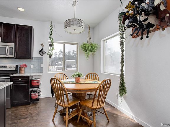 Fantastic open concept raised ranch home! Vaulted ceilings on the main floor with ample windows make this home light & bright. The lovely kitchen features beautiful dark wood cabinets, soft close drawers, granite slab counters, glass subway tile backsplash, pantry, stainless steel appliances (including refrigerator) & center island. The adjoining dining room & large, attached living room offers the perfect open flow for entertaining family & friends. Large deck maximizes the outdoor Colorado mountain lifestyle. Tasteful design elements include wood laminate flooring, designer lighting fixtures, ceiling fans & custom wooden stair railing. Desirable main floor primary bedroom features walk in closet & attached bathroom for easy living. The second bedroom is also conveniently located on the main level. The sunny, finished walk-out lower level with high ceilings offers a versatile bonus space for family room, office, game room or gym. The lower level also features a third bedroom & full bathroom. The separate lower entrance is ideal for multigeneration living or roommates. Enjoy peaceful mountain living on a flat, usable, .38 acre corner lot with ample parking. Great yard with fenced dog area, greenhouse & chicken coop. Plenty of room for your RV, boat & other mountain toys. Close in location to 285, schools, park-n-ride, public transportation & school bus stop provides ultimate convenience & accessibility. County maintained roads, good internet & reliable cell service. Enjoy nearby hiking, biking, fishing & Staunton state park. Only 15 minutes to grocery store, 30 min to Denver, 60 min to Skiing & 75 min to DIA. Welcome to your perfect mountain home!!!