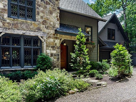 Welcome to an enchanting five-bedroom, five-and-a-half-bath English-style cottage in desirable Highlands Country Club. The fairy tale spell is cast by leaded glass, diamond grid windows, gorgeous doors and hefty beams inside and out, and a mossy copse hiding a rock patio, fire pit, and noisy waterfall. This home also boasts a sweet covered porch, a large deck, and a two-car garage. Nestled on a private lot, this property is the perfect blend of classic charm and modern living. Inside, you will discover a gracious foyer and thoughtfully designed floor plan, seamlessly combining elegance and function. The main level features living areas with cozy fireplaces and abundant natural light, creating a warm and cozy atmosphere. The gourmet kitchen is a chef's dream, equipped with double wall ovens, a five burner gas range, new refrigerator, ample storage space, and beautiful finishes. The dining areas will accommodate plenty of guests, who will want to socialize with the chef in the spacious kitchen, while sipping a fine wine from the 320-bottle cellar. This is an entertainer's delight, with a screened porch and outdoor deck that are perfect for reading, watching games, or dining. After dinner, you can move to the yard to roast marshmallows at the fire pit and listen to the three-tier waterfall. The five well-appointed bedrooms, each with an en-suite bath, provide ample room for relaxation and privacy, ensuring convenience and comfort for even the largest family. The main floor primary suite is a true retreat, and offers a luxurious spa-like bathroom, large closets, and additional space for full size laundry machines. Additional features include hardwood floors, crown molding, and updated lighting fixtures. The front yard is fully irrigated with a smart controller and separate water meter. Extras include an Aerus air filtration system (2021), Generac generator (2022), full crawl space encapsulation, and Leafguard gutters.