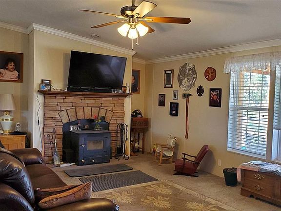 This 2015 Palm Harbor home is beautiful inside and out. Ground set on a permitted, permanent foundation there will be no trouble getting financing. 3 bedrooms, 2 full bathrooms, utility room, den and built in office. Added features include wood burning fireplace insert with blower, and a pass through closet from the utility room to the master bathroom for your linens. Front and back covered porches, garden area, RV hook-up, 12X32 detached garage, and 12X12 storage shed are just a few of the amenities on the property. There is also a 12X32 artist retreat that could be repurposed as a guest house or mother-in-law suite. The well-appointed kitchen is the perfect set-up for a budding chef. Private well is rated at 8 gpm and is set up with a continuous pressure system. The property consists of three contiguous lots with the home sitting on the middle lot. Stroll through the property on gravel and rocked walkways. This beautiful home is located in the quiet community of Blue Hills Ranch.