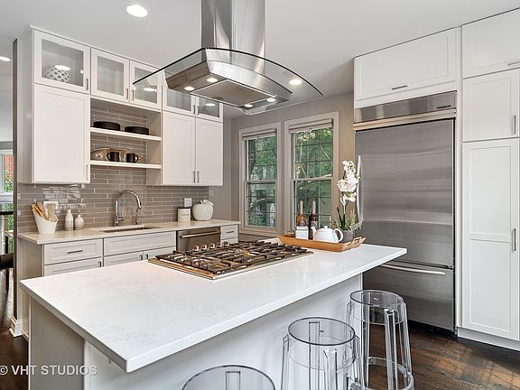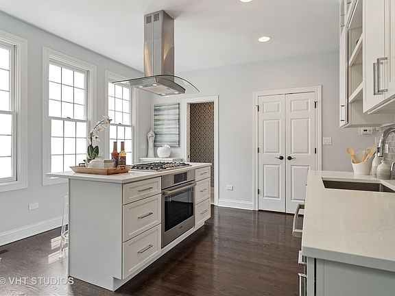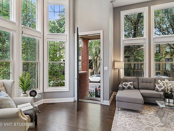 STUNNING FULLY RENOVATED townhome nestled on a peaceful tree lined street in the heart of bustling West Loop. Luxury finishes throughout: hardwood floors, cathedral ceilings, designer light fixtures, and a gas fireplace. North, East, and South exposures flood this END-UNIT with natural light through endless windows. Chef's kitchen with upgraded Kitchen-Aid/Bosch stainless appliances, Broan range hood, quartz counters, classic white cabinetry with soft close doors, walk-in pantry, and extra large separate dining room that overlooks dramatic 2 story living room. Entire 2nd floor dedicated to MASSIVE PRIMARY SUITE which easily accommodates a king bed! OVERSIZED primary bath features double vanity sinks, jacuzzi tub, separate steam shower, and UPGRADED finishes! Walk-in closet with CUSTOM built-ins is the SIZE OF A BEDROOM! Family room with wet bar and CUSTOM built-ins opens onto MASSIVE rooftop terrace with JAW DROPPING skyline views! Private attached 2 car garage INCLUDED!