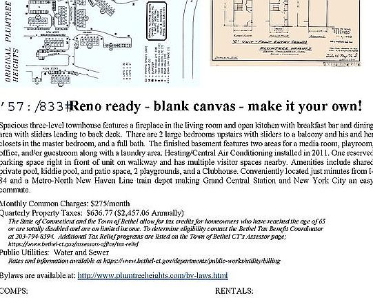 Spacious three-level townhouse features a fireplace in the living room and open kitchen with breakfast bar and dining area with sliders leading to back deck. There are 2 large bedrooms upstairs with sliders to a balcony and his and her closets in the master bedroom and a full bath. The finished basement features two areas for a media room, playroom, office, and/or guestroom along with a laundry area. Heating/Central Air Conditioning installed in 2011. 1 Reserved Parking Space right in front of unit on walkway and close to multiple visitor spaces. Residents have use of shared private pool and patio, playgrounds and Clubhouse reserved for Plumtree Heights residents. Conveniently located just minutes from I-84 and a Metro-North New Haven Line train station making Grand Central Station and New York City an easy commute.