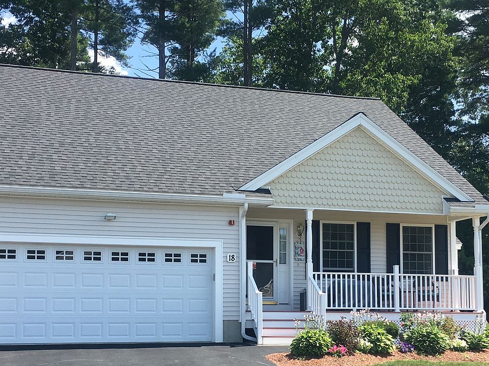 Condo is in a 55+ community, offers a farmers porch, 1750 sq ft, includes spacious first floor master with master bath and walk in closet, gas fireplace in living room with cathedral ceiling, spacious eat in kitchen with granite counters, breakfast bar and pantry. Appliances include gas stove, refrigerator, dishwasher and microwave. Gleaming hardwood floor in living room. The second level features large second bedroom, full bath and loft perfect for study/Office. Full-size unfinished basement. Two (2) car attached garage and deck off kitchen.